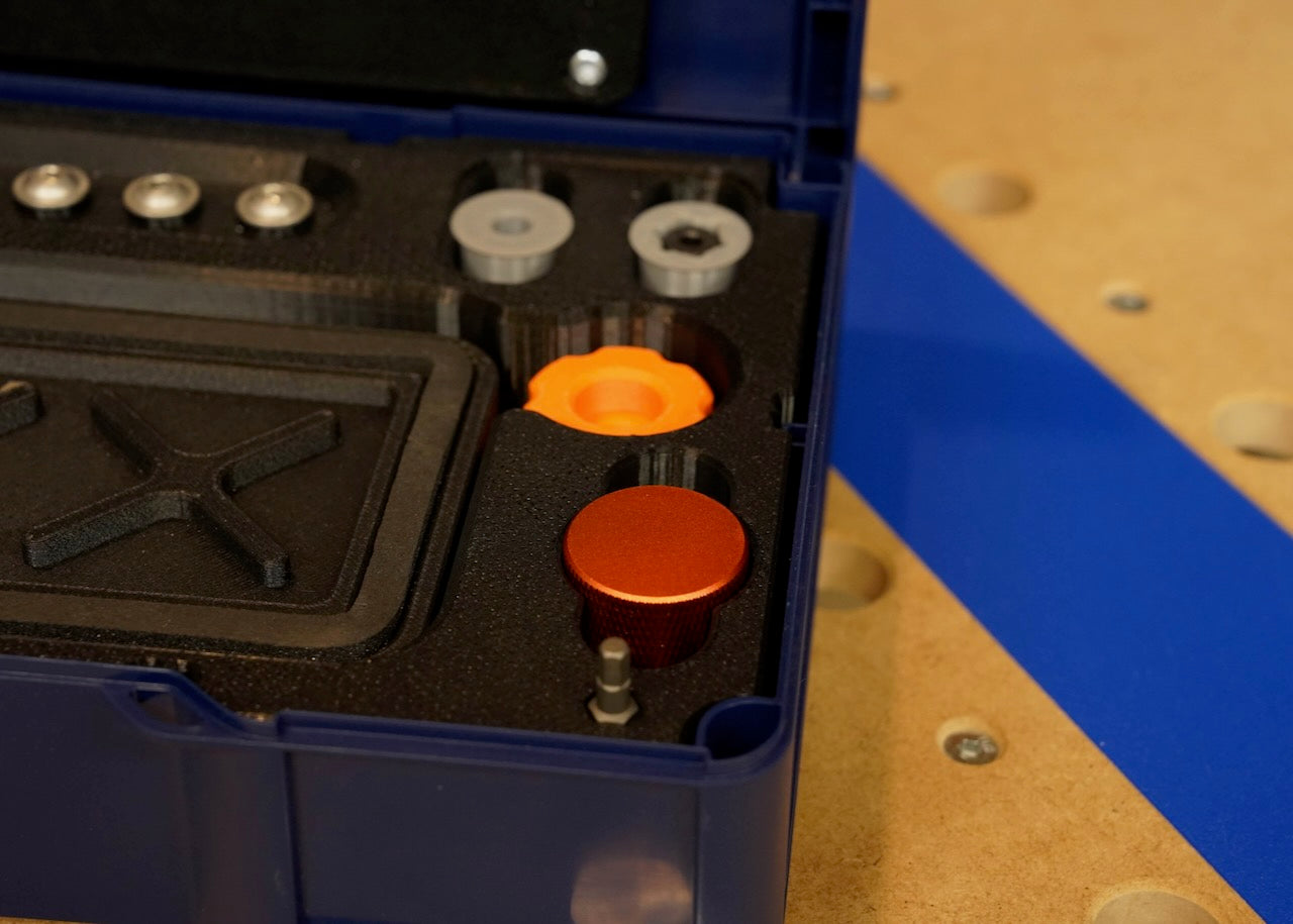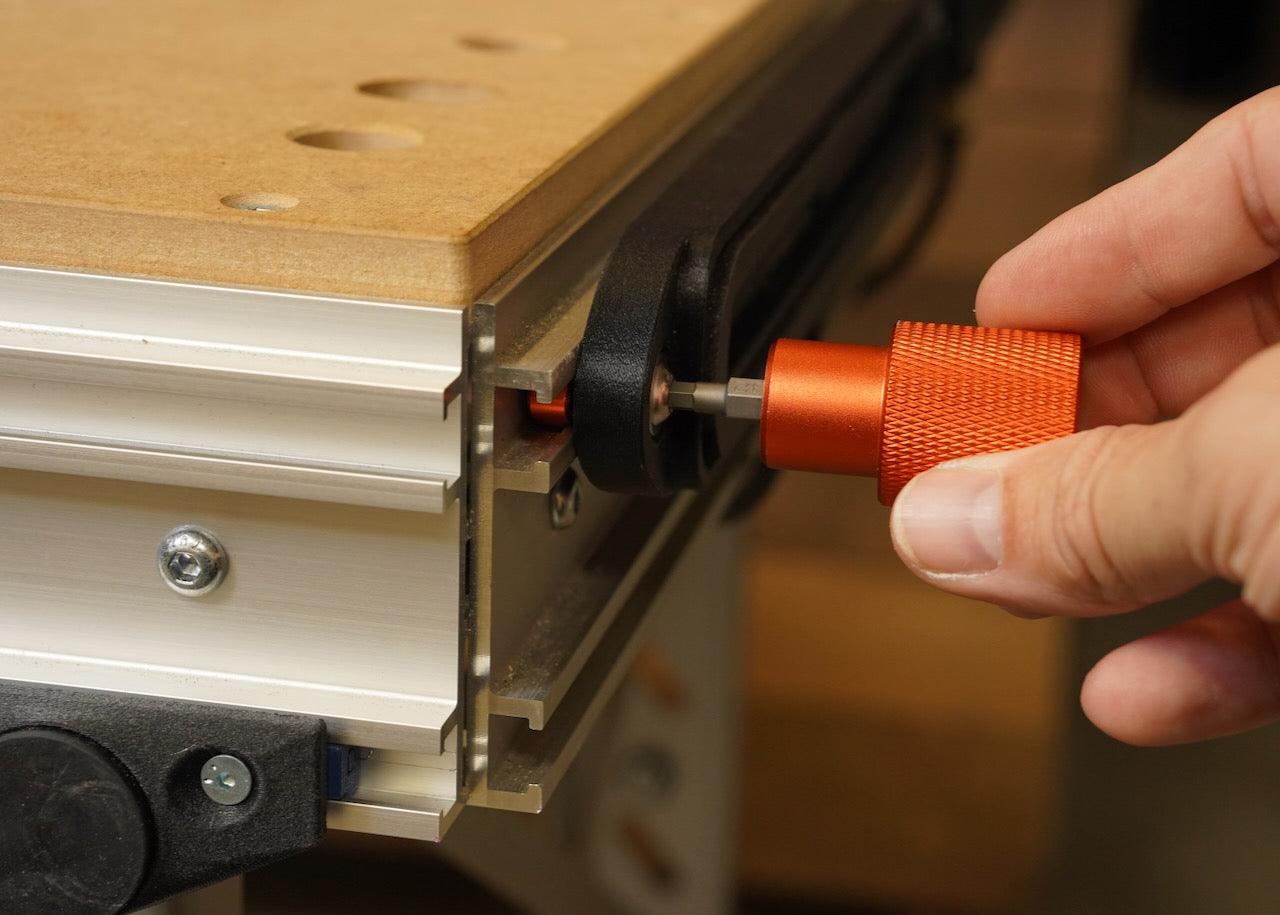 Argos is supplied with a 4 mm hex bit for use with our SYS-GRP system, but can be used with any standard 1/4" style bit for added versatility. Its dog-hole-ready body stores neatly in any 20 mm dog hole on your MFT bench so it’s always within reach.