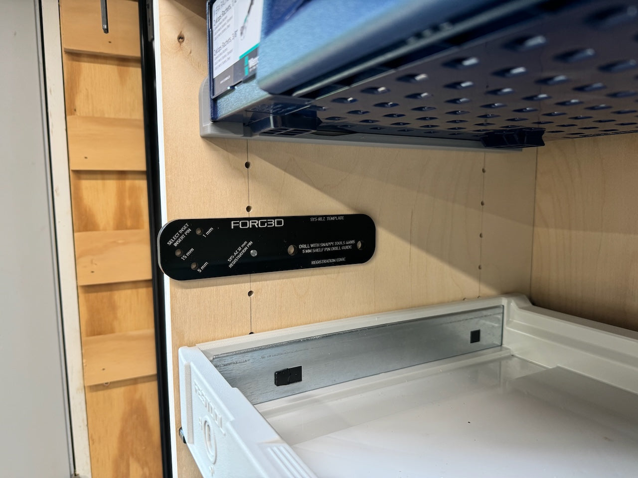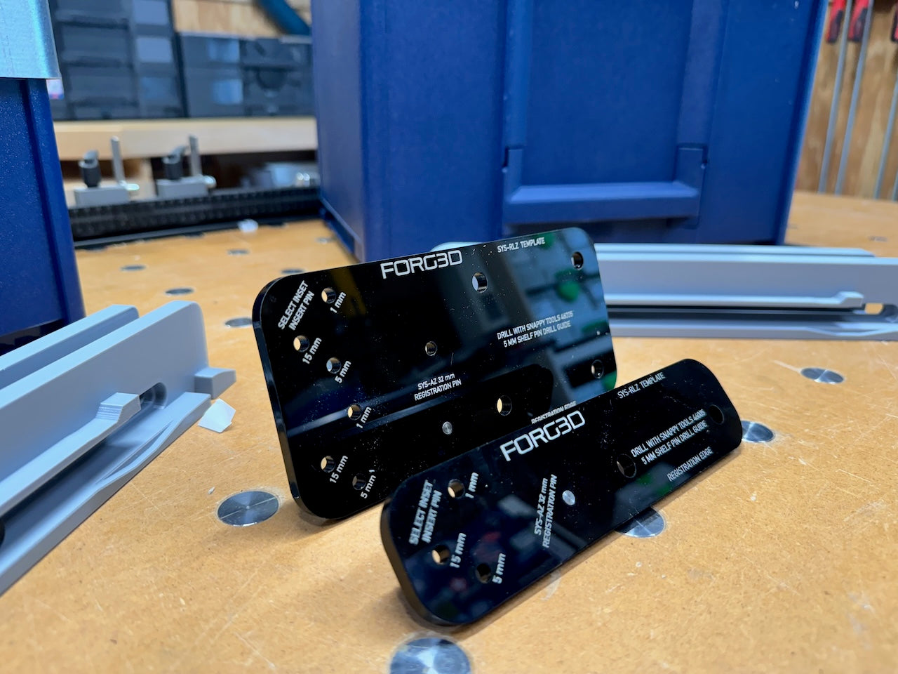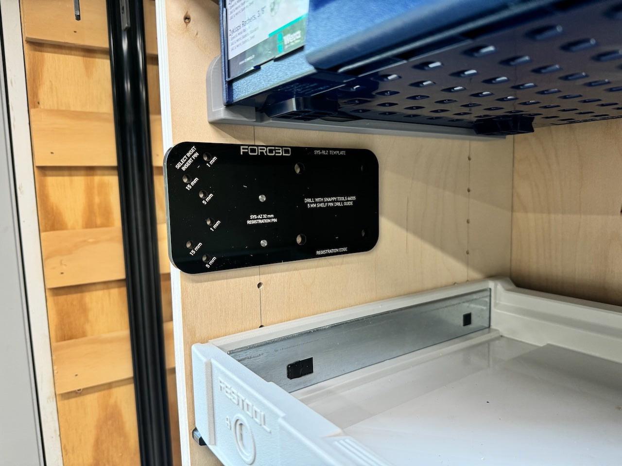 I ordered the Ogre Installation Template from Forged 3D and put it to use yesterday in my shop on a newly built set of shop cabinets. I dimensioned the cabinets to fit Sys AZ drawers for my Systainers but wanted to combine the use of the SYS-RLZ (rails) from Forged 3D for several M 112 Systainers as well. The template made it fast and easy to drill the holes for mounting the rails. Well worth the few $$ for the template.
